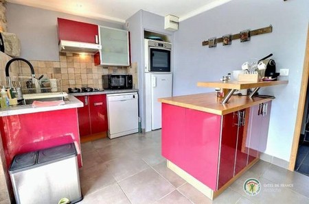 I ferieboligen er der et spiseområde med integreret køkken, der åbner ud til den skyggefulde sydvendte terrasse, en fantastisk lys stue med brændeovn, TV (TNT, DVD) og direkte adgang til haven.