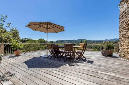 Hyggelig intim gårdhave, suppleret med en stor overdækket terrasse og en enestående panoramaterrasse på taget på 50 m². Fælles indhegnet grund på 2000 m², velholdt og beplantet (delvist skrånende med frugtplantage...), med en smuk swimmingpool (6x12 m) og en sportsplads.